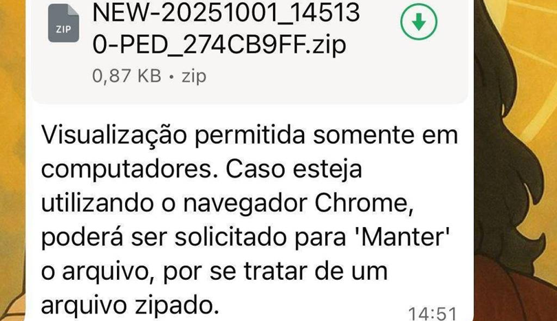 “Caso esteja utilizando o Chrome, poderá ser solicitado para ‘manter’ o arquivo por se tratar de um arquivo zipado”, acrescenta a mensagem fraudulenta.